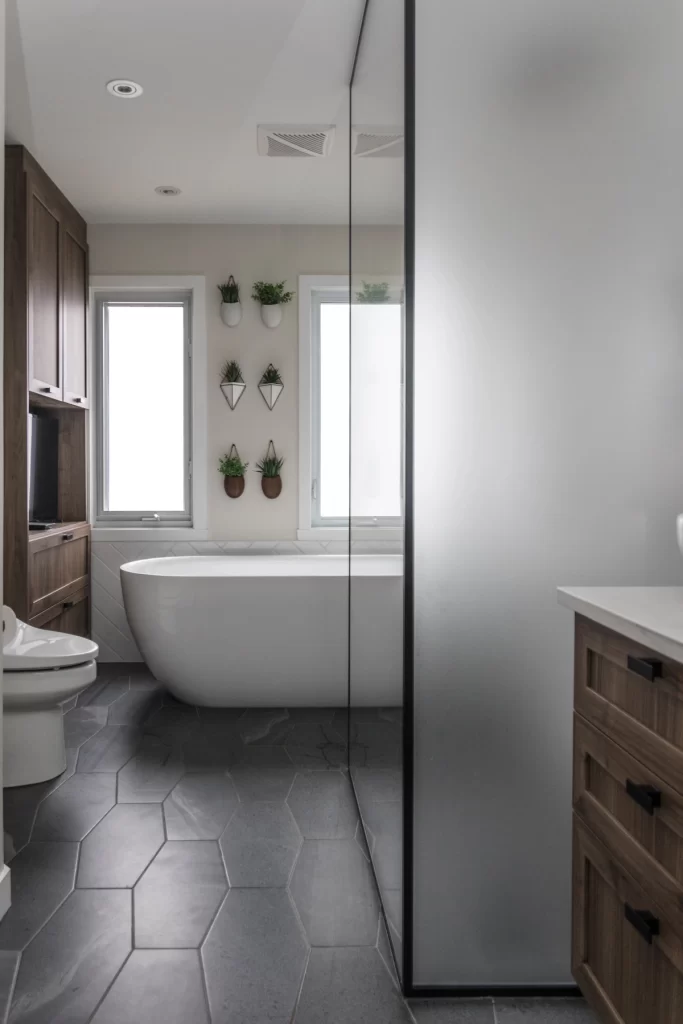 L’aménagement est beaucoup plus fonctionnel. La salle de bain est axée sur la détente avec le téléviseur et le plancher chauffant. L’intimité est conservée avec un panneau de verre givré.
